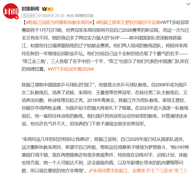 陈振江的新去处,恰正是转头往日弟子身边,他与朱雨玲的师徒情缘始于2008年,其时14岁的朱雨玲刚入选国度二队,“朱雨玲这几年的资格十分让我感动。”陈振江坦言,正是弟子这些年的坚捏打动了他,使他决定在退休后从头出山,匡助朱雨玲不竭追梦,朱雨玲连年来资格了从寰宇第一到因病休战,再到2025年复出斩获好意思国大满贯女单冠军的跌宕过程,有了恩师的加入,她的团队如虎添翼